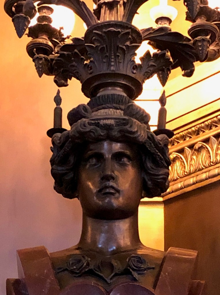 Mais qu’est-ce donc que ce détail ? Une petite salamandre orne de part et d’autre la rampe centrale. A l’époque de Charles Garnier pourtant, une des deux n’existait pas, à la place on pouvait y trouver un dragon (côté cour). Les deux veillaient sur des conduites de gaz sortant de la maçonnerie afin d’alimenter les torchères et autres sources de lumière. Le dragon a malheureusement disparu à une époque indéterminée, sans doute victime d’un collectionneur bien mal intentionné. Faute de modèle permettant de le refondre, Alain-Charles Perrot (architecte en charge de la restauration de l’Opéra Garnier à partir de 1995) fait copier la salamandre en l’inversant. Aujourd’hui, les deux cracheuses de feu surveillent les fils électriques mieux que quiconque !
