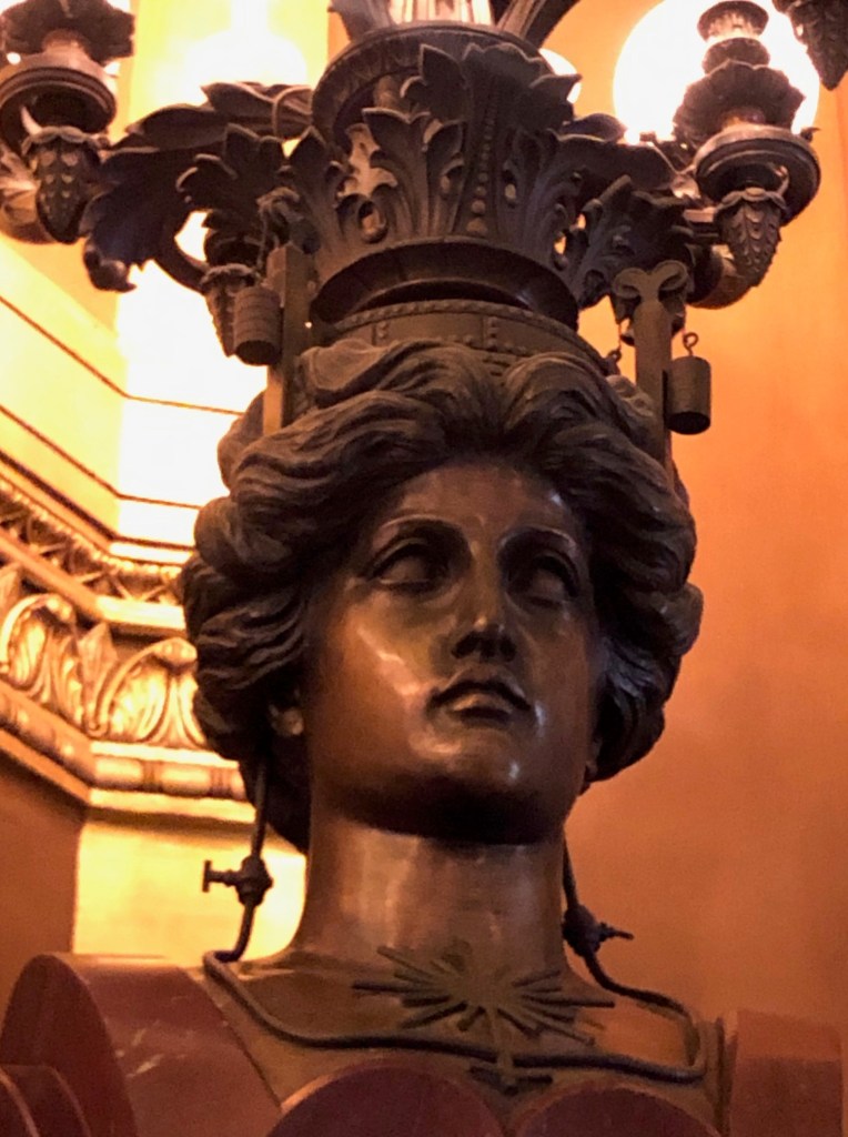 Mais que sont donc ces détails ? Ces bustes ont été réalisés par Félix Chabaud. Ils illustrent les techniques d’éclairage. Le Gaz : une jeune personne coiffée d’un manomètre et portant des tuyaux en guise de colliers. L’Huile : une lampe antique en couvre-chef et des branches d’olivier en sautoir. L’Electricité : une pile à auges sur la tête et portant des bijoux de fils et bobines électriques. La Bougie : une ruche flanquée de quatre bougies allumées en guise de coiffure.