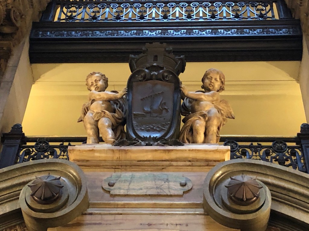 Mais qu’est-ce donc que ce détail ? Deux enfants de marbre blanc s’appuient sur les armes en bronze de la ville. Une fois repéré vous l’avez compris : Fluctuat Nec Mergitur, le vaisseau de la ville de Paris vogue malgré les intempéries.