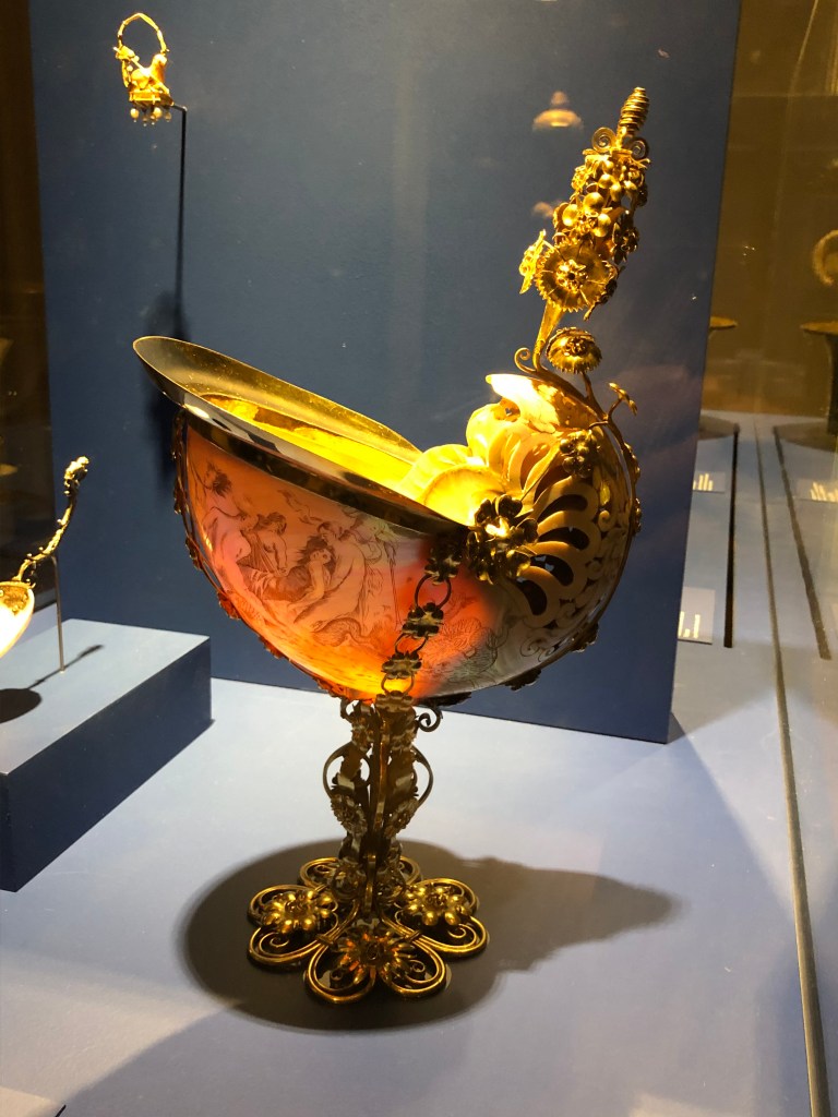 Cet objet précieux est composé d’un coquillage exotique que l’on appelle « nautile », son nom savant est « Nautilus pompilius », il est originaire du Pacifique.